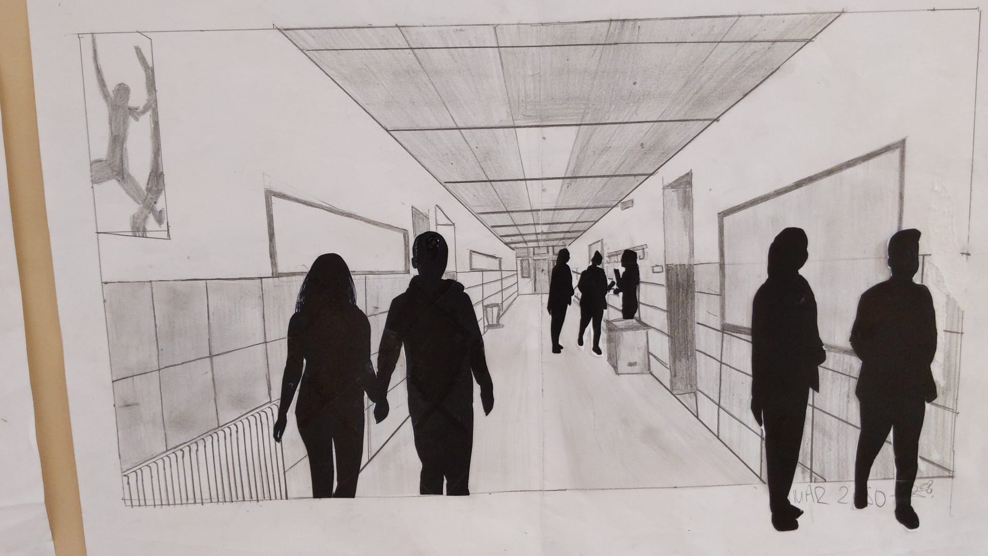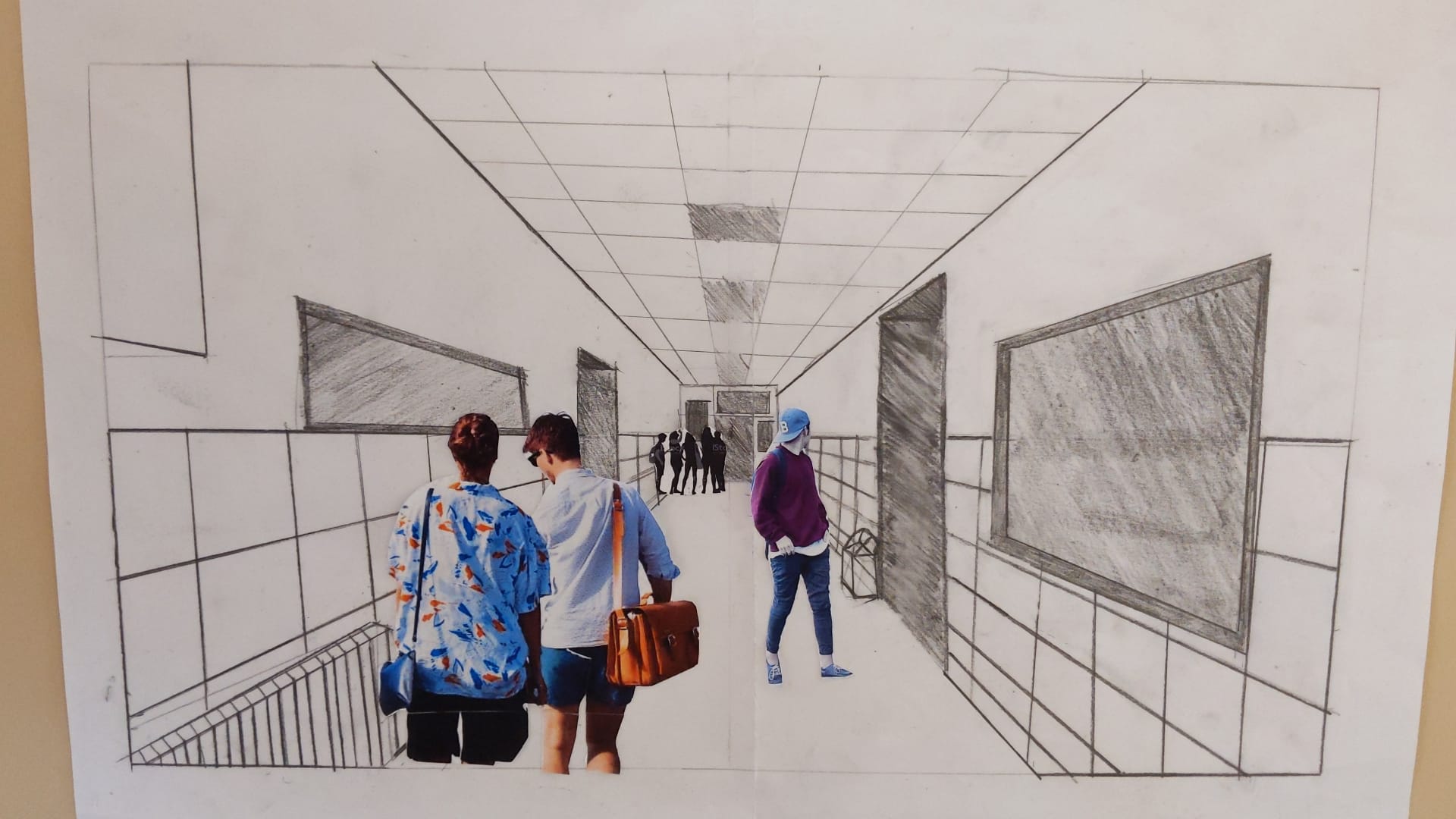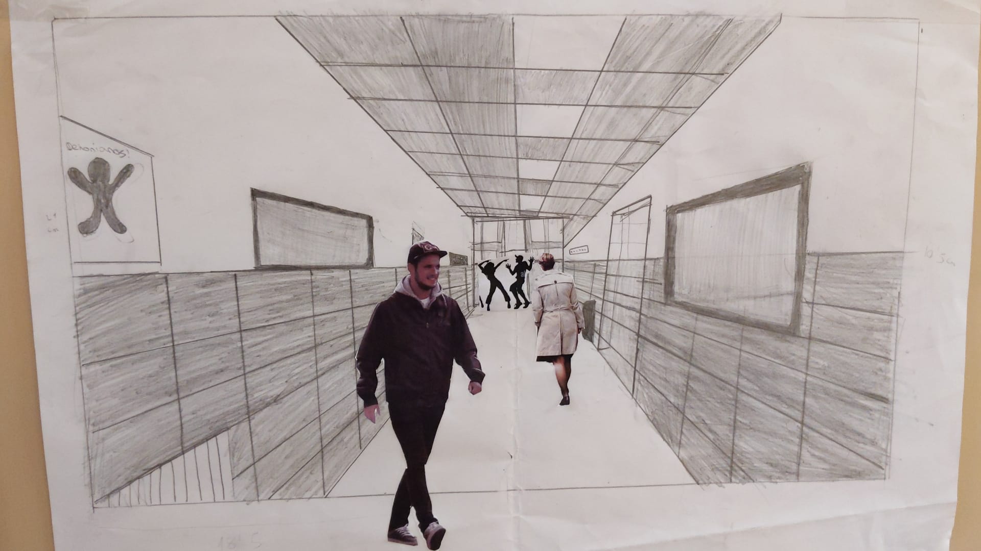 Trabajamos la perspectiva con un punto de fuga dibujando el pasillo y decorando con siluetas de personas.
